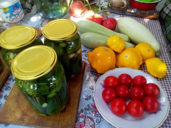 Всем добрый вечер! А я кладу в банку и перец, и огурец, и дольку лука ( для мужа)), и перец сладкий, и чесночек, и капустку ( что есть -цветная или белокачанная), и помидор, и патиссон. Всего понемножку.. Что есть в наличии. В 2-х или 3-х литровые банки. Называется Сад-огород. Одно НО: надо в духовке греть...Но семье очень нравится. Делаем так много-много лет.