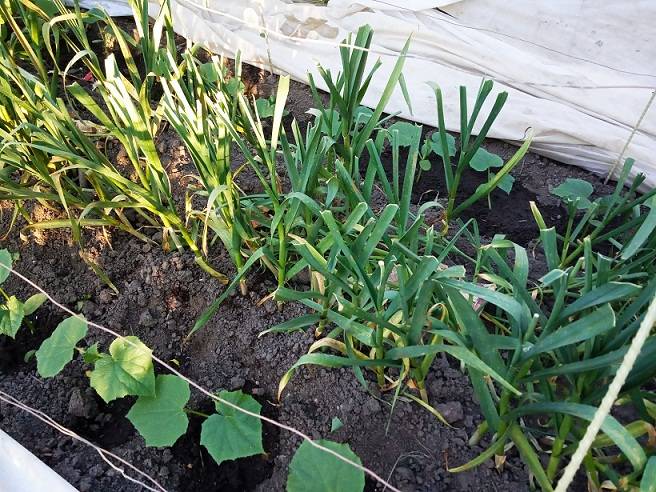 Подстригла чеснок,чтобы не мешал огурцам.В этой грядке посажен чеснок для летнего потребления,а но головку посажен на другой грядке и пропадает от ржавчины,никогда такого не видела.Что-то у меня в этом году на всё напали болезни
