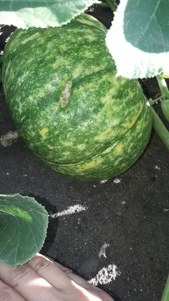 Зато первый плод тыквы Конфеткм приобрел характерную тыквенную корку и пестрый рисунок. Как рептилия теперь - плод потемнел и обзавелся желтой разметкой. Ну и еще подрос, быстро все-таки плоды у тыквы размер набирают, словно надуваются. Только недавно ведь выкладывала фотку, буквально в начале этой недели. Завтра еще сфотографирую и покажу. Сколько там завязей понятия не имею, я видела штук 6 в прошлый раз, но там такие заросли...