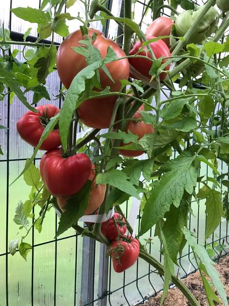 Хех, у нас похолодание на 3 дня, считая с завтра. От +20 до +22 и температура ночью +11. Потом теплеет. Дождь позавчера, потом ночью, вчера днем не было (хотя тучки были), полило сегодня. Дождь нам нарисовали и на завтра. Из за резких перепадов, да еще и с водой начали трещать помидоры в ОГ. В выходные на Мирабелле не было ни одной трещинки, а сегодня сунулась - спелые почти все надтреснутые! Безобразие. В ОГ море белокрылки, она у нас почему-то вот к августу буйствовать начинает. В ОГ всречаются подгнившие плоды, фу, гадость. Клондайк выспел сразу кучей кистей (весь нижний и часть среднего яруса), но во первых дивно корявый в этом году, а во-вторых некоторые с трещинами. В общем то, что соберу сегодня вечером в ОГ явно пойдет на сок. Правды ради надо сказать, что уродливое и потрескавшееся не все. Некоторые кусты хороши. Надо будет отметить и на вкус оценить. Нам сажать в ОГ надо устойчивое.