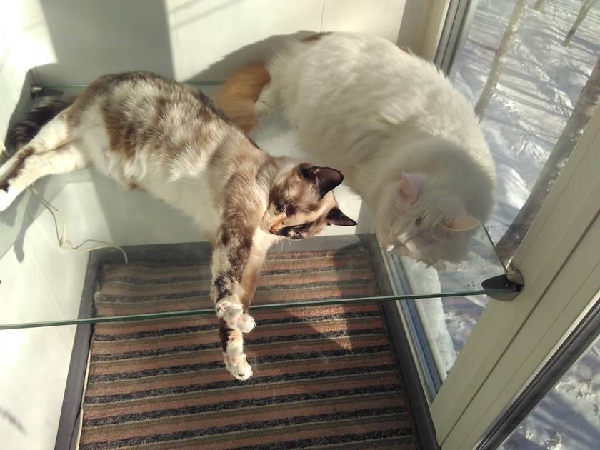 Ну а как не отпраздновать Всемирный день кошек, у меня куча лакомств приготовлена для Твиксов, они, пока нижняя полка рассадой не занята, с удовольствием на солнышке нежатся