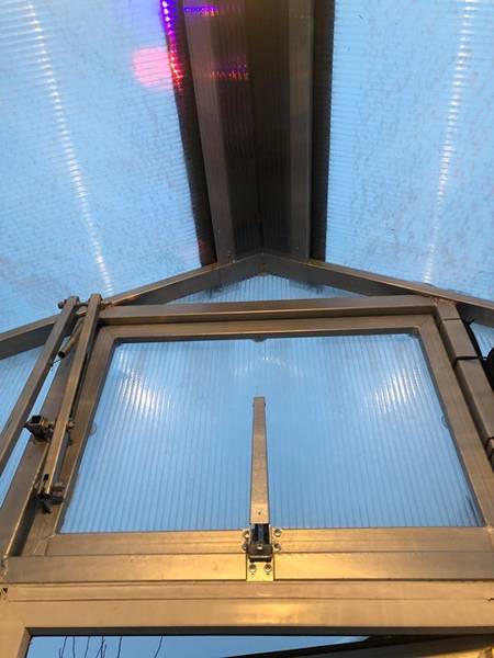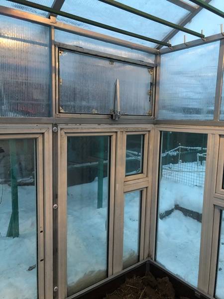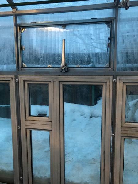 На зиму ( для начала раннего весеннего использования теплицы для сохранения тепла) из поликарбоната изнутри приворачивается уголок по длине конька, весной/летом уголок отворачивается ( у меня он состоит из трёх частей) и убирается.