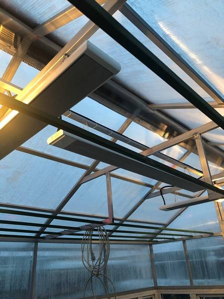 Установлены три инфракрасных  обогревателя (2 по 700Вт и 1 на 1кВт). Использовались два по 700Вт, так как на 1 кВт обогреватель вышел из строя практически сразу.