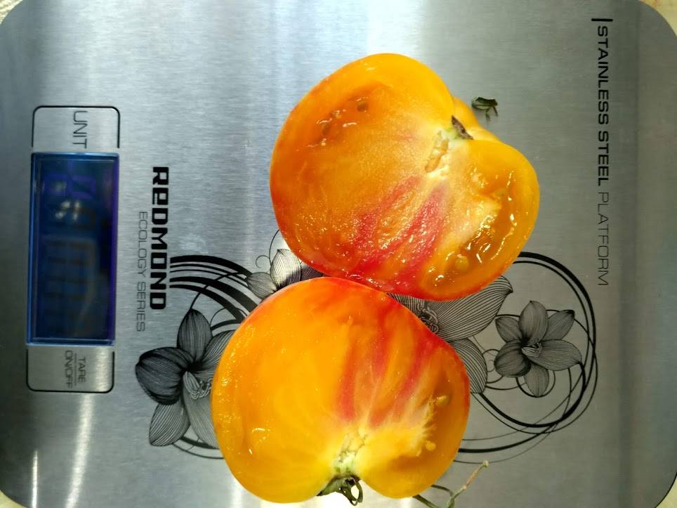 :hi:  У меня Блаш рос в теплице 1,6 м  хилый. Цвет алый с желтыми полосками. Первые две кисти очень вкусные, а потом шкурка стала плотной и вкус обычный. Вес от 9 до 78 гр. Вес со всего куста 1250  :dnt: