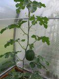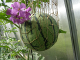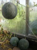Еще к вопросу о соотношении размер растения/размер арбуза. В прошлом году у меня один сорт никак не хотел завязываться и завязался, когда плеть уже была под 3 метра. Вот он в сравнении с другими арбузами того же сорта.