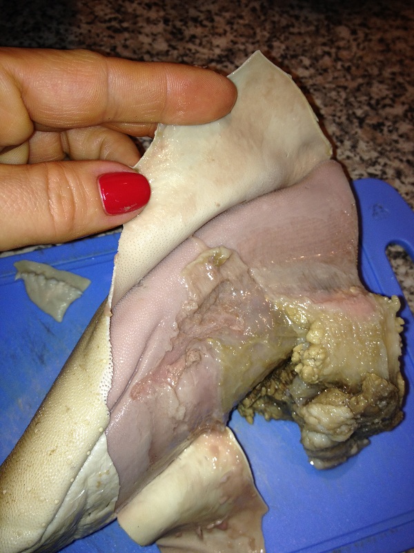 Кладем на бочок, держа под наклоном нож, вырезаем дольку (нож ставим вплотную к пленочке сначала с одной стороны, потом с другой):