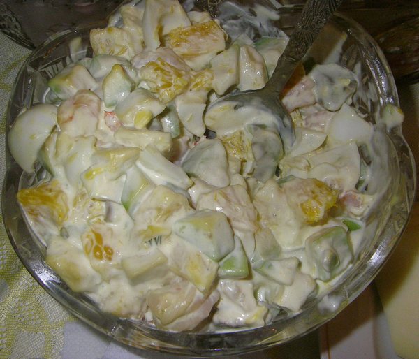 Докладываю: если Сашин салат сделать с японским майонезом (я тут добыла по случаю, раньше не встречала в продаже, а теперь в отделе, где всякая фигня для суши, можно приобрЕСТЬ и такое чудо) - то это вообще улет! Чуть майонеза + остатки апельсинового сока из "каркаса" (что остается при чистке апельсина) и така вкуснота, така вкуснота!!!!!  :yep:  :niam: