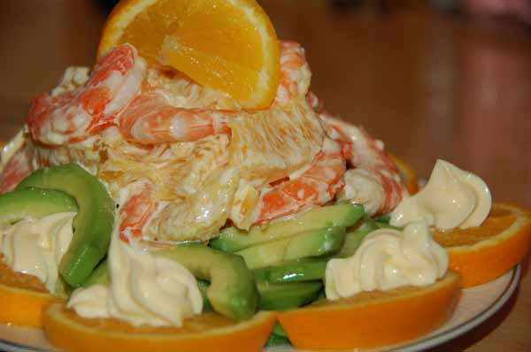 2 апельсина, 2 авокадо (не твердых, чуть мягких), 2 крутых яйца и с полкило вареных креветок (удобнее взять очищеных). Апельсины очистить, порезать крупными кусочками. Авокадо - удалить косточку, порезать тоже крупными кубиками. Яйца покрошить, все смешать, заправить майонезом. Все...Приятного аппетита!  :niam: