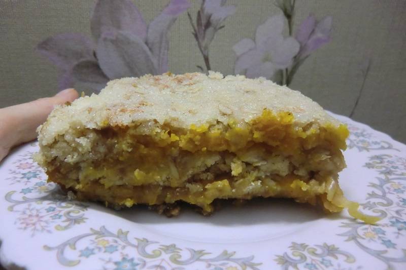 А начинку делала так: тыквы взяла чуть больше 700гр (столько было), порезала ее крупно (квадратами примерно как спич коробок) в кастрюльку, на дно 3-4 ложки воды, крышкой накрыла и на самом маленьком огне до готовности. Она получается как на пару. Можно и запечь в духовке, но мне так проще и быстрее. Воду слила. Поблендерила, добавила корицы (можно мускатный орех, ванилин и тд). Получилось вкусное пюре. Взяла 3 яблока, потерла на терке. И вот как в рецепте слоями выложила: тесто, яблоки, тыква, тесто, яблоки, тыква, тесто.