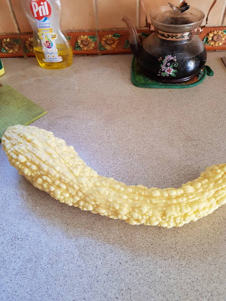 Галя,это крукнек. Что то среднее между кабачком или тыквой. Вот только не помню,почему один раз попробовала и больше не выращивают. Может твердым быстро становится и горчит ? Помню,что даже икру кабачковую делала,он крупинками остался.