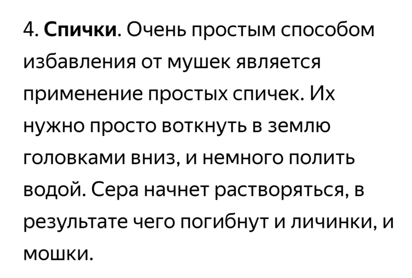 Мы на работе с коллегой использовали спички от мошек цветочных. Купили цветочную землю в магазине для пересадки цветов и она была заражена личинками мошек очень здорово видимо. Через несколько дней как распаковали пакет и пересадили цветы в комнате появились мошки, и с каждый дней все больше. Химию применять не хотели, попробовали спички: воткнули в землю головками по нескольку штук на горшок. Через несколько дней заметили, что мошек стало меньше, а потом и совсем пропали. А в пакете с остатками земли плотно завязанными этих мошек было видимо-невидимо через месяц. Заметили случайно, выбросили весь мешок.