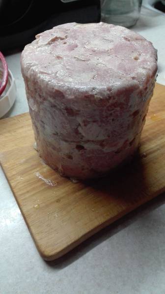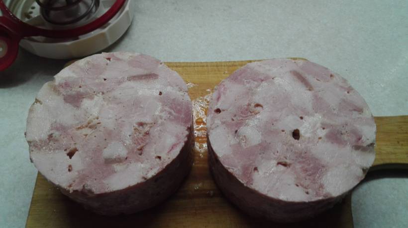 И девочки правы, что выше писали, без нитритной соли никак. Иначе это будет просто котлета другой формы. И цельномышечная ветчина с использованием нитритки совсем другое дело, а не просто кусок мяса. А уж как вкусны домашние сосиски, это вообще не передать словами. Но их так долго и заморочно делать, а съедаются в момент..А ветчина в ветчиннице это легко и просто. Отличная штуковина.