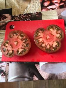 Более красные снаружи . Но срез точно такой же, как и у меня  Но он в Рязани выращивает, там намного более солнечно и теплее, чем у меня. Думаю, при лучшем освещении они станут немного покраснее снаружи и останутся темными на срезе