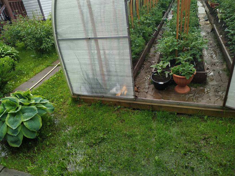 Утро началось не с кофе. Ночью прошёл дождь да какой!!!!  Только вчера вычерпала проходы в теплице и там даже немного подсохло и вот опять снова здорово! Ну сил больше моих нет, видимо пора окончательно смириться и принять своё бессилие перед стихией. Вычерпала 5 вёдер, поняла, что это мёртвому припарка. Воды сколько было столько и есть.