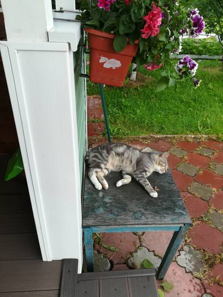 У меня вялый привялый дождь, громыхало и грохотало час насухую, потом закапало, сейчас капит и длинные длинные раскаты грома. Свежо, но тепло. Кот устроился уютно под навесиком, почивает после вкусной плошки сметаны. Сметану обожает, теперь у меня все банки выкидываются идеально чистые, наш кот, мы тоже сметану лопаем немерянно. Опять снимала клещей, пора второй раз обрабатывать, то не было их недели 2, сейчас опять, вкусный он видимо.