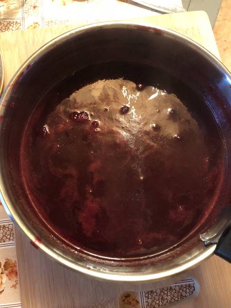 А на фото где красная, я сначала блендерила 30 секунд ( вместе с хвостиками и веточками)проварила, протерла через сито и добавила сахар (меньше гораздо чем в рецепте) и проварила, чтобы сахар растворить и разливала ещё кипящим, так как при выключении желируется в кастрюле уже.