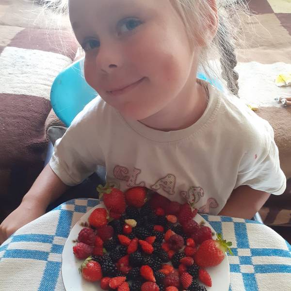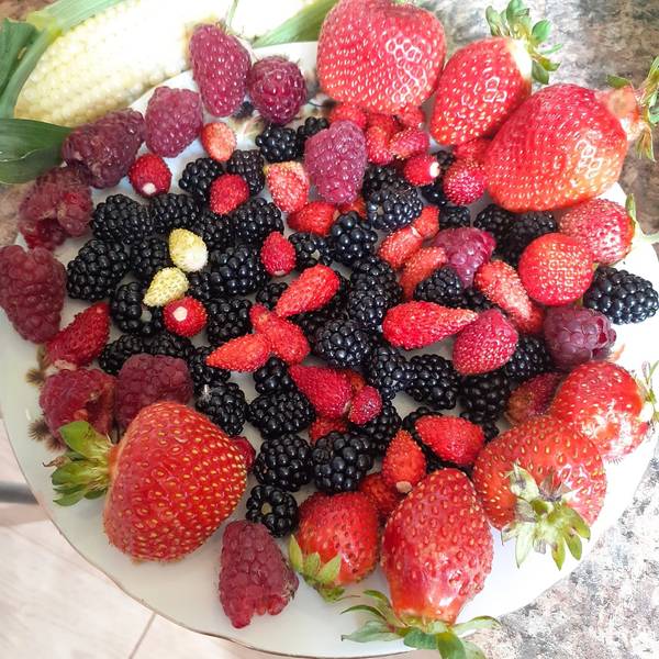 1. Блю Бьюти+Рашен Роуз.  Напоминает родителей. Почти идеальный цветочек с лепестками как у Блю Бьюти.  Сразу видно созревание - загорается ярко-розовый огонек. Красивый вкусный и сочный сорт. Явно может дать больше чем дал у меня. Потопы и чудовищная жара помешали ему проявиться во всей красе. Но! плодов достаточно много и на верхушке есть и малыши.    В общем достойный и очень красивый сорт.