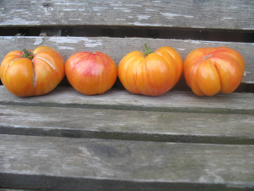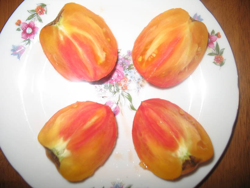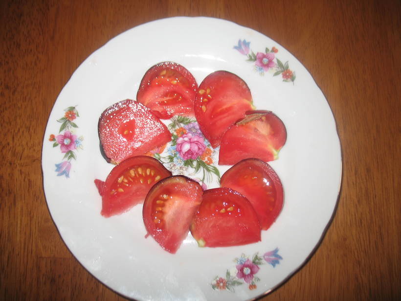 Красивый, плодовитый сорт. Томаты с насыщенным классическим томатным вкусом.  Мякоть не водянистая, скорее сочно-арбузная. Томаты не мелкие 200-300 грамм.