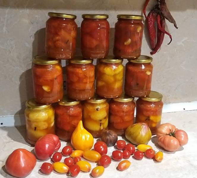 Сегодня сделала помидоры без шкурки в томатном соке.  в банках в основном Сливки Бендрика,  Розовая сосулька,  Джалпа,  Дрова.