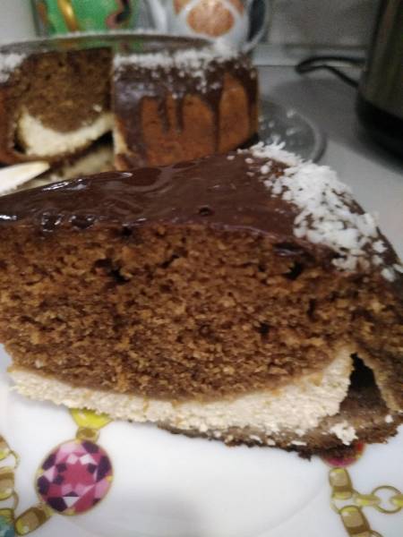 Шоколад + масло слив. топим доступным способом (в в микроволновке растопила) не перегревать. В миску яйца, щепотка соли, взбиваем, добавляем сахар, взбиваем до пышности и побеления массы. Добавляем шоколад растопленный, соединяем миксером не взбивая. Ну и муку с разрыхлителем просеянные. И добавила кокосовую стружку. Дальше надо смазать чашу мульти маслом растительным. На дно выложить кружок бумаги пекарской, а стенки я присыпала сахаром (можно мукой). Выкладываем часть шокотеста (примерно половину), дальше творожную начинку, разронять можно аккуратно, сверху оставшееся тесто. И на режиме выпечки выпекать приблизительно час 20мин (нужно по своей мульте смотреть какие режимы есть. Отрыть, проверить шпажкой. Если нужно допечь. Дать остыть в мульте. Выкладываем на блюдо и украшаем в меру своей испорченности))) Можно присыпать пудрой, можно полить шоколадом, можно ничего не делать. Я свою  кексоватрушку украсила шоколадом и кокосовой стужкой. Приятного чаепития! :03niam: