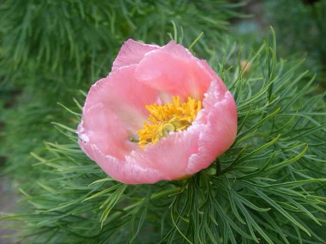 Лососево-розовые, элегантные, простые цветы на крепких стеблях с самыми свежими зелеными и мелко нарезанными листьями, которые только можно себе представить. Природный вид, узколистный пион. Сильно рассечённая тонкая листва, невысокий куст около 45 см. в высоту, небольшие, простой формы цветки, мягкого розового цвета. Ранний.