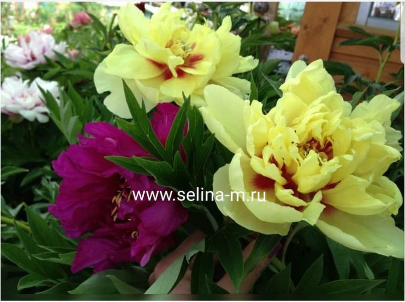 Пион Сонома Эдо. (Irene Tolemeo, USA, 2010). Ито-гибрид. Средне-раннего срока цветения. Цветок махровый, желтый, он имеет самое большое количество лепестков из всех Ито-гибридов. Этот сорт цветет в течении ОЧЕНЬ длительного периода времени. Он начинает открывать свои цветы перед цветением Bartzella и продолжит цвести когда Bartzella уже отцветет. Высота куста 80 см, диаметр цветка 20 см.