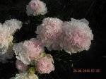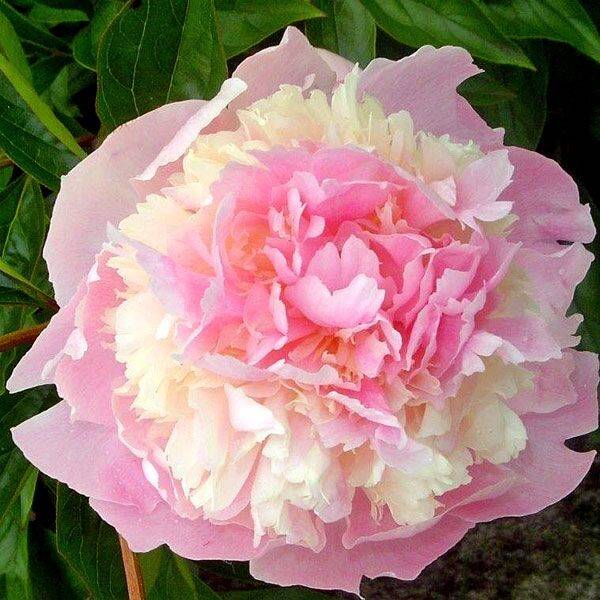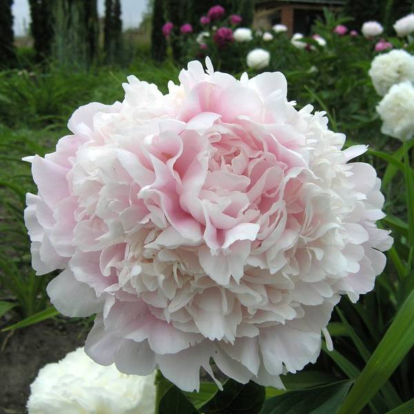 Chiffon Parfait Klehm, 1981, США  Махровый розовидный - шаровидный. Цветок крупный, диаметром 19 см, красивой формы, напоминает десерт из взбитых сливок, сливочно-розовый c лососёвым оттенком, затем белеет.