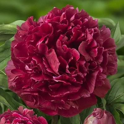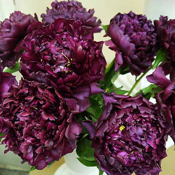 Пион Highlight (Paeonia lactifolia ‘Highlight’). Молочноцветковый среднепоздний пион.Сорт выведен в 1952 году, но и до сих пор является фаворитом. Производитель: Auten,Wild. Пион ‘Хайлайт’ привлекает к себе внимание благодаря огромным цветкам размером со столовую тарелку. Они густомахровые, компактные, полушаровидной формы. Их окраска довольно редкая – темно-бордовый цвет с шоколадным отливом. Этот сорт известен также своими глянцевыми лепестками. Внешние лепестки крупного размера, внутренние – более узкие. Они плотно прилегают к внешним лепесткам, образуя полушарие. Тычинки малозаметные, желтые. Цветки обладают легким приятным ароматом. Размер цветка – 17-20 см в диаметре! Цветоносы крепкие. На каждом из цветоносов образуются по три и более цветка.  Листья темно-зеленые, дважды тройчатые, заостренные, выглядят отлично на протяжении всего сезона.  Он очаровывает, благодаря пышному цветению.  Подходит для срезки. Этот сорт морозоустойчив и устойчив к засухе. Высота взрослого растения – 85-90 см.
