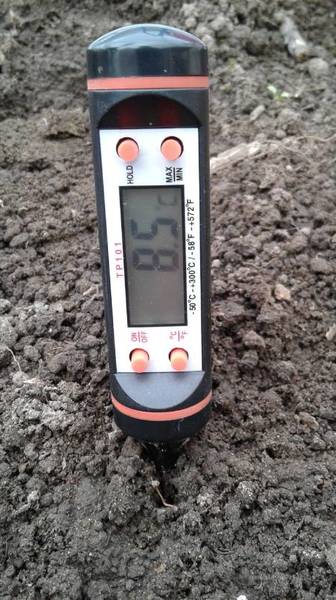 У меня обычно зелень в теплице всходит через 2 недели после посева. А в этом году видимо за счет нескольких теплых дней в апреле все взошло через неделю - салат, редиска, лук на зелень (грядки тоже перекопала перед этим). Даже укроп взошел, он обычно всех позднее всходит. И сорняки появились рано.  А это признак того, что земля начала прогреваться.