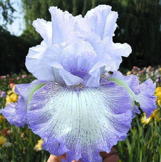 ACOMA - очень красивый ирис, довольно крупный, устойчив к любым погодным условиям, с хорошим ростом. Кайма иногда бывает очень широкой и занимает больше половины лепестка. Если кому-то нравиятся голубые ирисы, рекомендую обратить на него внимание. Бледно-голубые стандарты.  Фолы цвета слоновой кости со светло-фиолетовым узором пликаты по краю. Высота цветоноса:  70 см. Ранний. Награды:  HM-92, AM-94, WM-97.