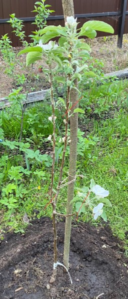 Помогите советом, пожалуйста. Посадила грушу колонку и яблоню Легенда на подвое Малыш Будаковского. У груши толстый короткий стволик ок 20см., его же не надо обрезать при посадке? А у яблоньки вилка из двух веток  на верхушке. Надо одну на кольцо обрезать? и вся в цветочках она.. обрывать? жалко так..