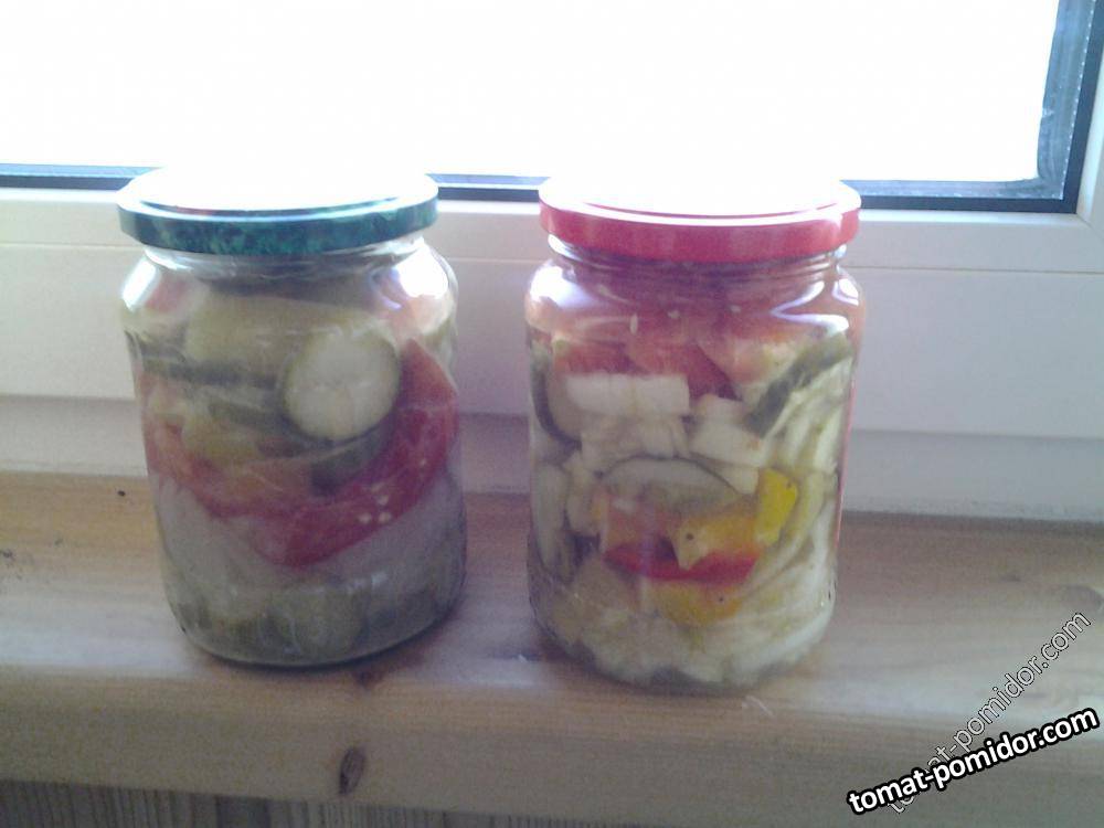 Нарезать лук, перец, огурцы и помидоры. В этой последовательности положить в банки.