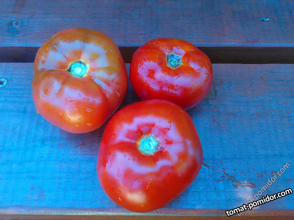 высота не превышает 50 см. Отличительной особенностью является то, что основной ствол на высоте примерно 20 см начинает изгибаться вниз. На нем вырастают пасынки, которые тоже стремятся к земле. Таким образом получается невысокий стелющийся куст. Томат достаточно крупный, весом до 200 грамм, красного цвета, мясистый и вкусный. Это сорт не требует пасынкования и подвязки. Сорт очень ранний и скороспелый. Плодоношение начинается в июне и продолжается до заморозков. Причем помидоры, лежа на холодной земле, мало подвержены порче, они очень долго сохраняют свои вкусовые качества, не растрескиваются и не гниют.
