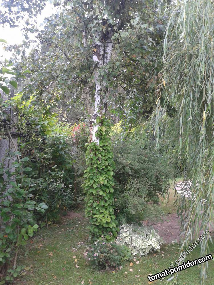 растет 10 лет ,не цвела,у соседки цветет,но она ее опускает на зиму.а моя присосками цепляется за березу.
