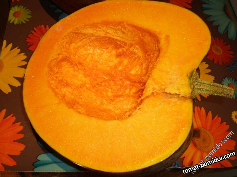 Плоды: плоские круглые, ребристые; Размер (DxH): 25 - 50 см х 15 - 30 см; Мякоть ярко-оранжевого цвета; толстая, твердая, волокнистая, слегка водянистая; сладкая, фруктовая, ароматная, отличное качество; Применение: супы, пирожные и торты, варенье / джемы, а также для еды сырые;
