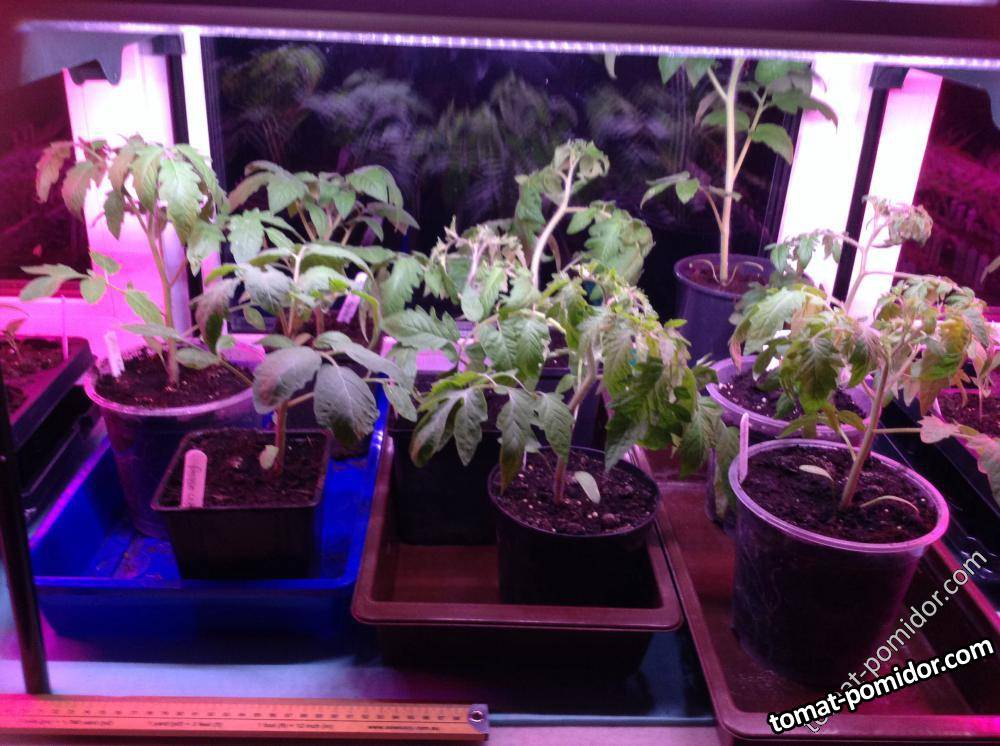 Пять контрольных томатов (справа) после 24 часов в теплице при низких температурах