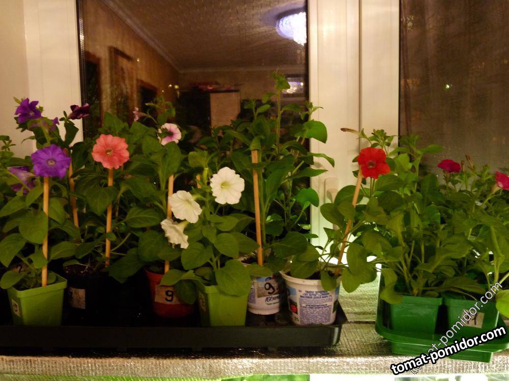 Цветущие на окошке петуньи