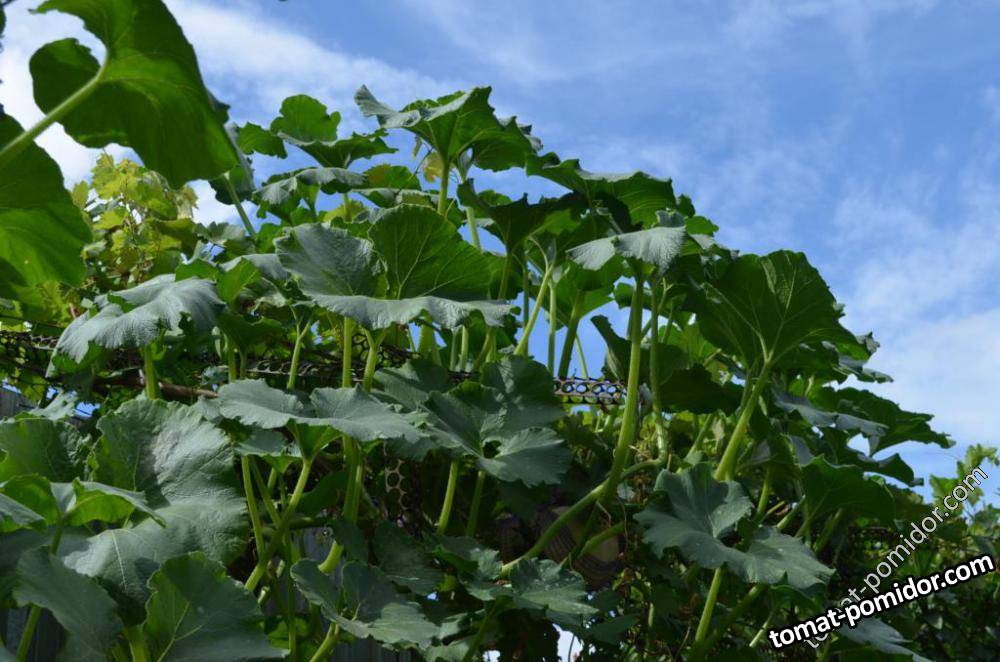 Листья тыквы с толстым стеблем, растение плетётся на шпалере на высоте более 2 метров.