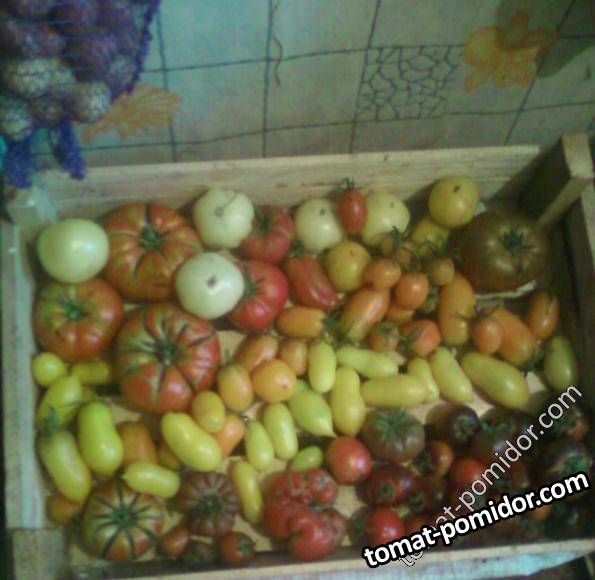 В правом верхнем углу, вокгруг ПШ разложены томаты, которые ко мне попали как сорт" Желтая сосулька". Явно видно, что это не совсем сосульки, и совсем не желтые- оранжевые они! Для сравнения посередине ящика высыпан Золотой дождь, разница очевидна.