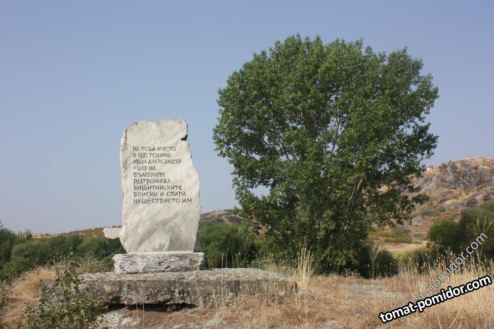 Памятная стелла на месте, где болгарская армия одержала победу над арией Византии. Дословный перевод надписи на стелле - "На этом месте в 1332году Иван Александр, царь Болгар, разгромил византийские войска и остановил нашествие их"