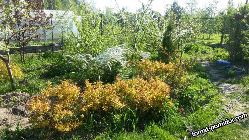 10 мая. На переднем плане Спирея японская Goldflame на заднем цветет Спирея серая Grafschaim