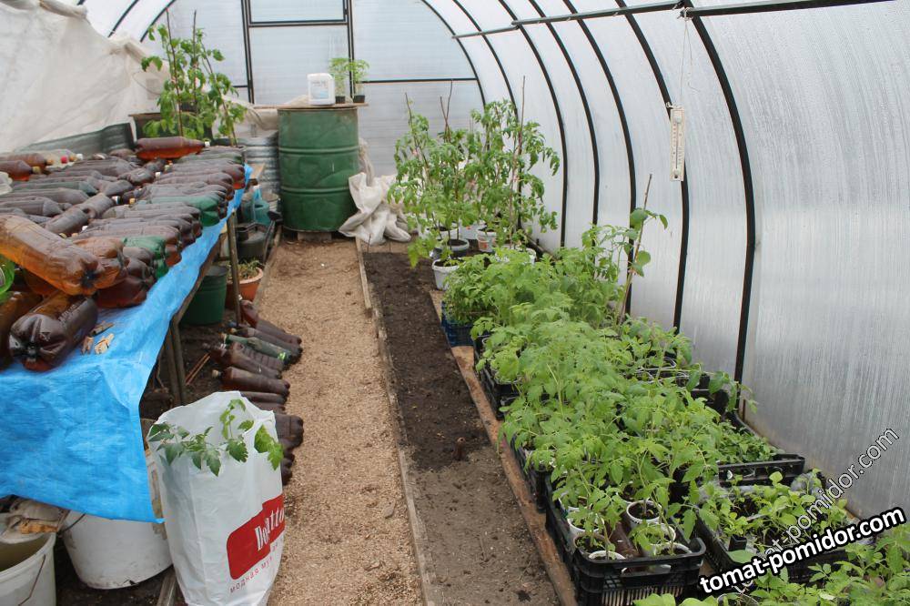 Бутылки с водой на солнце нагреваются, на ночь на них поднимается рассада. От поликарбоната плюс нетканка почти до середины и вниз спускается сбоку то же нетканка.