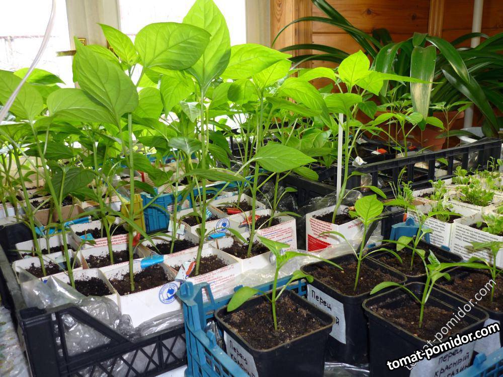 Перец, посеянный 22 февраля сильно вытянулся. На улице холод. На переднем плане - перчик, посаженный в середине марта из семян магазинного перца.