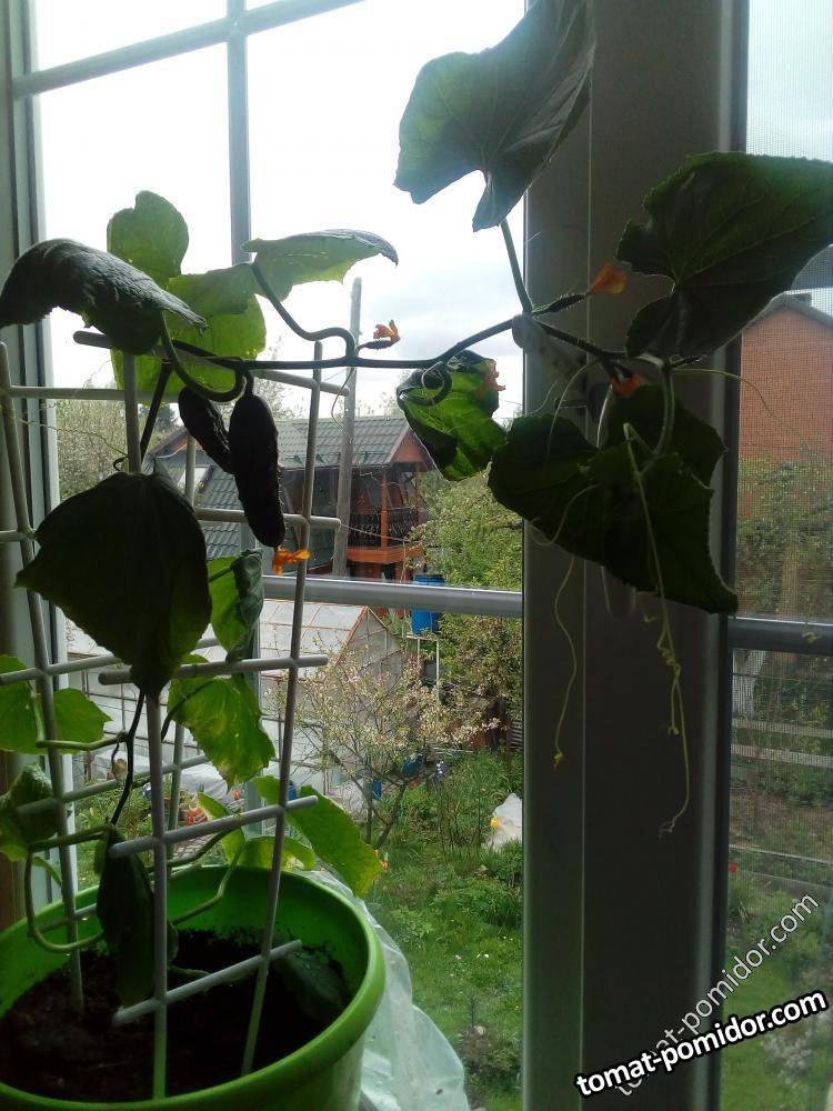 Огурец в ведре на подоконнике