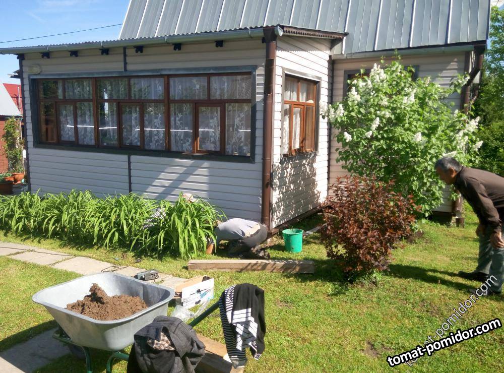 Рабочие поправляют фундамент под верандой