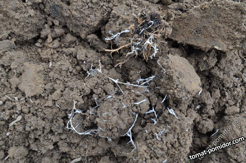 Грибковая сеточка около прошлогоднего корня томата