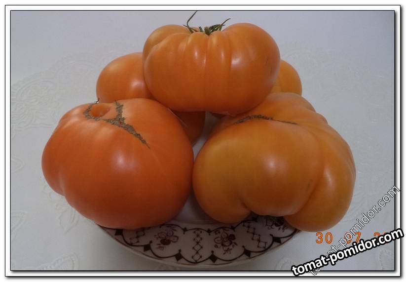 Среднеспелый сорт, индет, плоды оранжевого цвета, плоскоокруглой формы, крупные (250-400 г), салатного назначения, сбалансированного вкуса, мякоть бифштексного типа, нежная, сочная, хорошо держит форму в нарезке, со сладким послевкусием, деликатес!