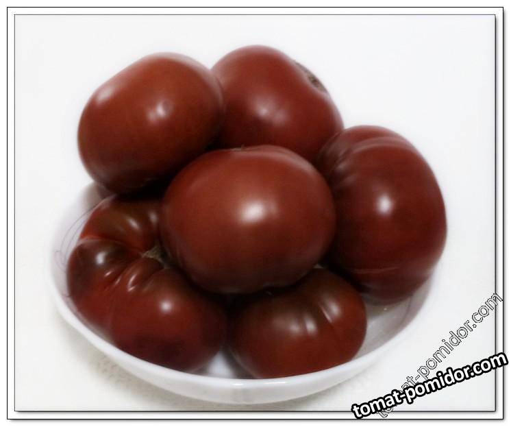 Среднеспелый сорт, индет, плоды черно-коричневого цвета, плоскоокруглой формы, мякоть бифштексного типа, нежная, сочная, сбалансированного вкуса, со сладким послевкусием, крупные (300 г), салатного назначения, урожайный.