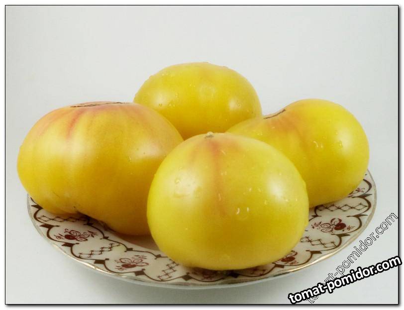 Среднеспелый сорт, индет, плоды биколор - желтого цвета с розовой шапочкой, и розовыми разводами в разрезе, плоскоокруглой формы, мякоть бифштексного типа, сочная, нежная, светится вся, гармоничного вкуса со сладким послевкусием, деликатес, плоды средние(150-300 г), салатного назначения, кисти полные, куст хорошо развит. Супер-сорт по красоте и вкусу!