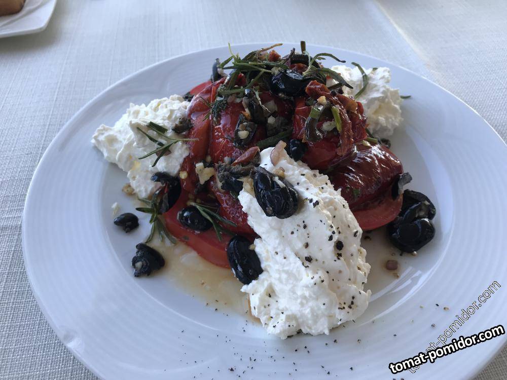 салат домати,печен пипер, меко сирене и маслини
